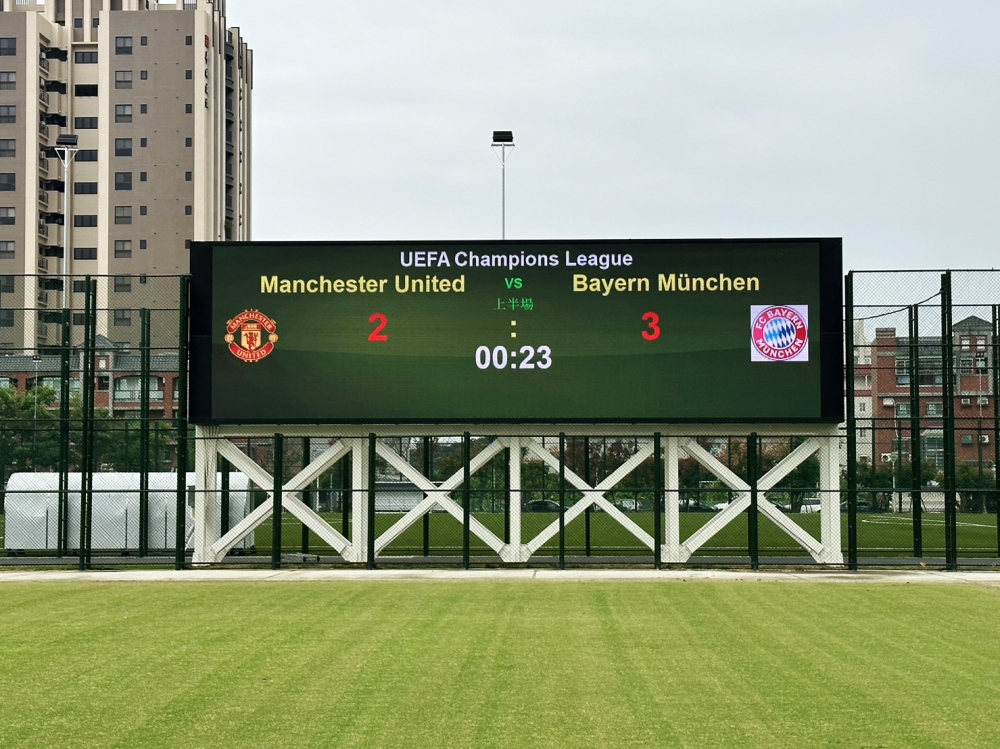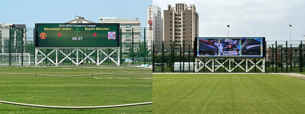 ⺠⾜球運動,帶動在地⾜球運動風氣。計分板採⽤喬光體育計分系統LED電視牆,喬光計分系統的版⾯設計,功能性佳是專業級體育賽事